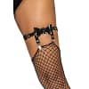 Vegan leather thigh high bow garter with adjustable elastic straps and cute heart ring accent.
