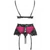 A gorgeous and seductive lingerie set with an elegant cut, made from an exceptionally delicate burgundy satin and exquisite lace in a deep black tone. Satin bra with thin, adjustable straps decorated with lace. The decorative garter belt, sensually tied with a black ribbon at the back, is also a combination of satin and lace, and includes a thong.