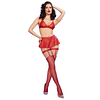 Completing the look is a sexy skirt that hugs the hips in a daring style, accentuating your figure. The matching thong adds an extra touch of allure, while garters and stockings create a complete, seductive set that pairs flawlessly with the entire ensemble.