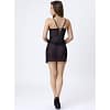 Elegant and chic T-shirt made of elastic and smooth material in deep black. With thin adjustable straps, fitted to the body and long to mid-thigh. Above the cups adorned with intricate lace, there are charming stripes finished with a jewel heart. The back is tied with a black ribbon, with lace inserts at hip height. Thong included.